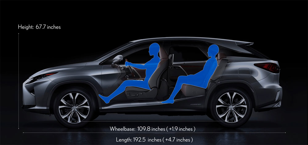 The 2016 RX is 4.7 inches longer than the current 2015 model but keeps relatively the same width and height. This is great news for anyone concerned about new RX fitting in their garage!