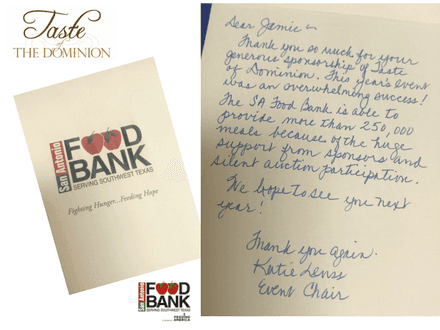 “Thank you so much for your generous sponsorship of Taste of Dominion. This year’s event was an overwhelming success! The SA Food Bank is able to provide more than 250,000 meals because of the huge support from sponsors and silent auction participation. We hope to see you next year! Thank you again” – Katie, SA Food Bank Event Chair